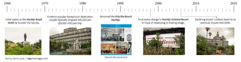 From my understanding the hotel had two name changes. Hachijo Royal Hotel (1963-1996), Priscilla Resort Hachijo (1996-2003) and Hachijo Oriental Resort (2004-2006).