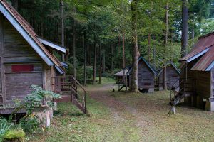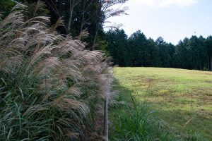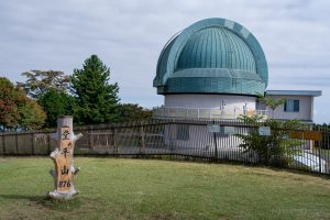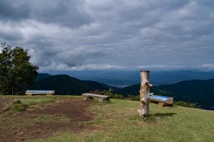 The trail from Kasayama-toge to Mt. Dodaira passes through both plantation and natural forests. In the natural sections, the path tends to become unclear due to fallen leaves. About 20 minutes from Kasayama Pass, the view opens up, revealing a roped-off area—the site of the Dodaira Paragliding School, a large grassy field with a spectacular view. Follow the rope, and you’ll emerge in front of the former National Astronomical Observatory. From here, follow the signs and turn right to reach the summit of Mt. Dodaira 堂平山 (876 m). There’s a vending machine and taps to refill your water bottle at the nearby campground.