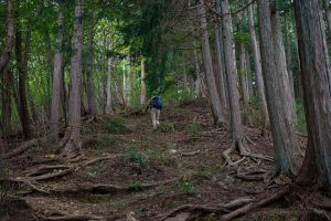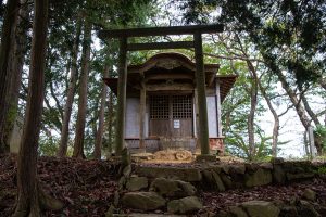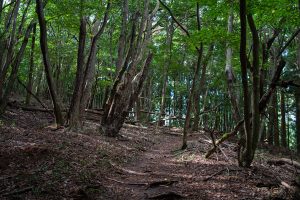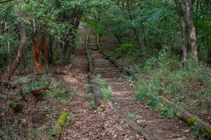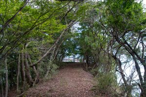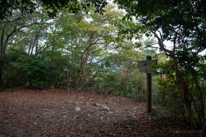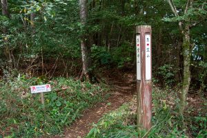After reaching the ridge, the trail becomes gentler toward the first peak, Mt. Kasayama 笠山 (837 m). The actual summit lies a little further on, marked with a small shrine, though there isn’t much of a view. Return to the trail junction and begin heading toward Mt. Dodaira. The first descent is the steepest on this course, with fixed rope on hand if needed. After descending from Mt. Kasayama, you’ll arrive at the same second forest road. Continue straight ahead, veering right back onto the mountain path. Where the trail rejoins the forest road is Kasayama-toge 笠山峠.
