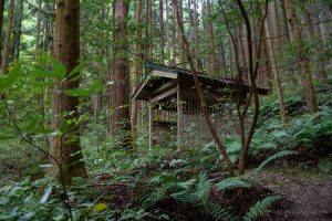 At the top of Kengamine 剣ケ峰 (876 m), reached via some washed-out wooden steps, stands the NHK radio relay station building. From the top, turn right and descend toward Shiroishi-toge 白石峠. At this intersecting pass there’s a covered rest area—a good spot to take a break before the final stretch.The last section back to Shiraishi-shako bus stop follows the Kanto Fureai Trail, which eventually joins a paved road. It takes about 40 minutes from Shiroishi-toge to reach the bus stop.