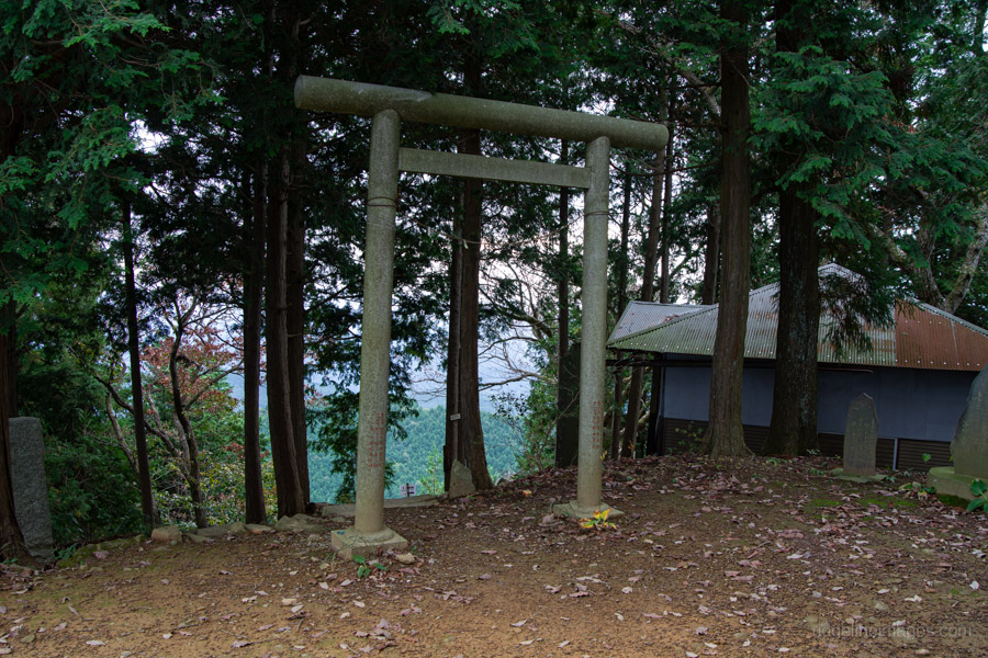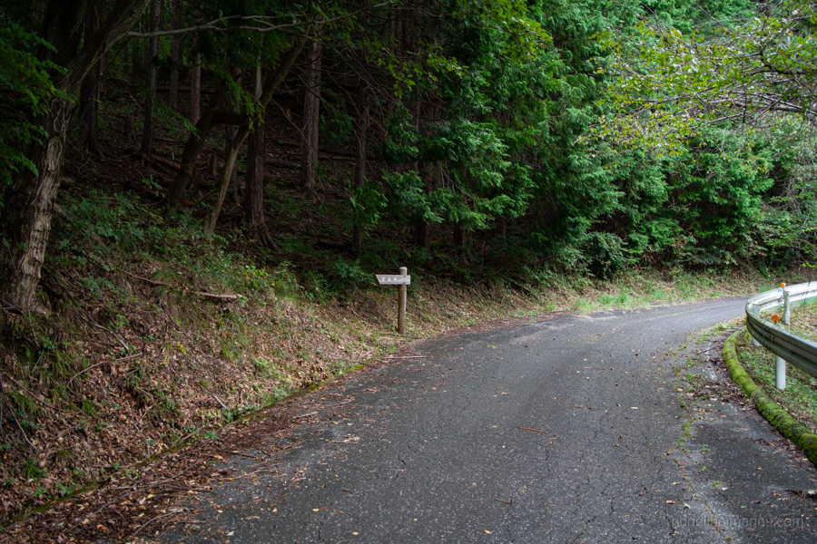 After reaching the ridge, the trail becomes gentler toward the first peak, Mt. Kasayama 笠山 (837 m). The actual summit lies a little further on, marked with a small shrine, though there isn’t much of a view. Return to the trail junction and begin heading toward Mt. Dodaira. The first descent is the steepest on this course, with fixed rope on hand if needed. After descending from Mt. Kasayama, you’ll arrive at the same second forest road. Continue straight ahead, veering right back onto the mountain path. Where the trail rejoins the forest road is Kasayama-toge 笠山峠.