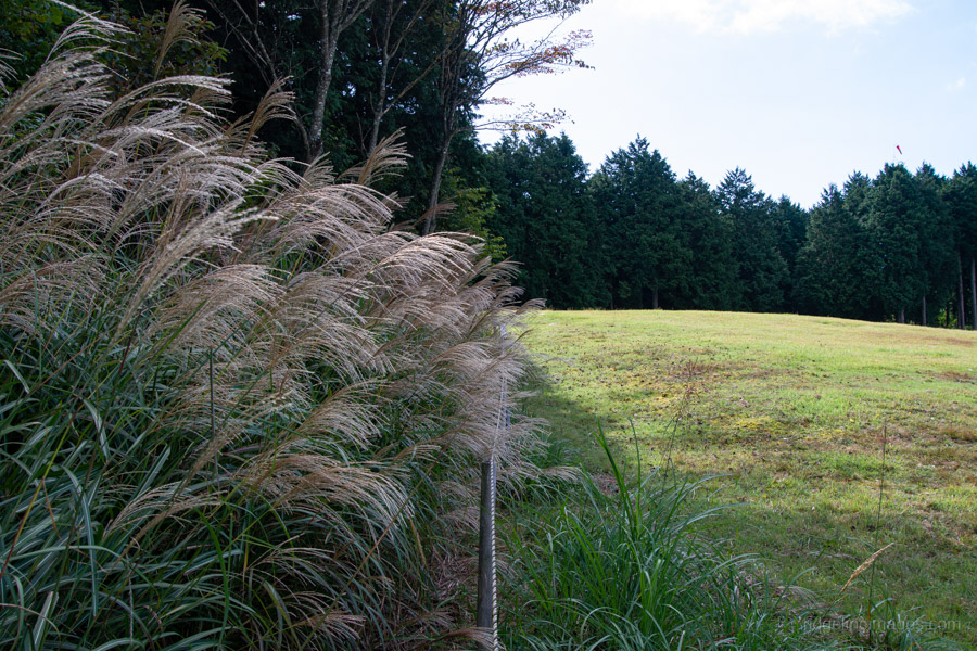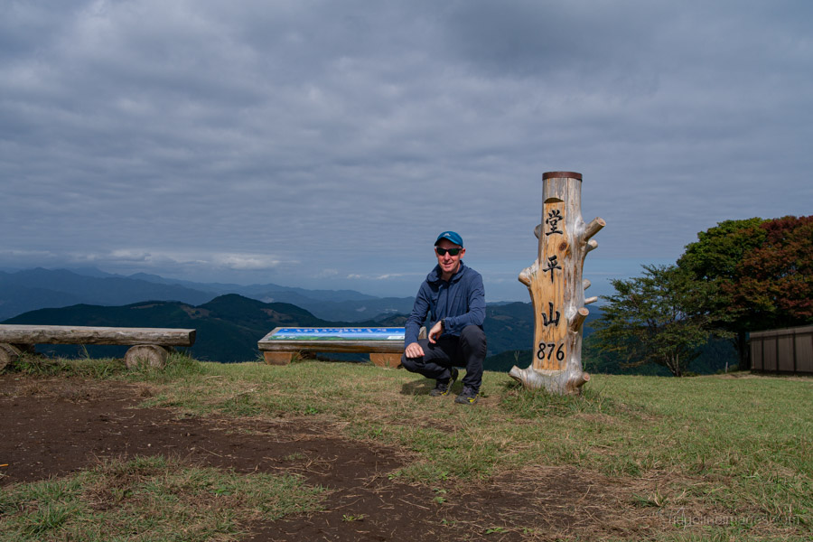The trail from Kasayama-toge to Mt. Dodaira passes through both plantation and natural forests. In the natural sections, the path tends to become unclear due to fallen leaves. About 20 minutes from Kasayama Pass, the view opens up, revealing a roped-off area—the site of the Dodaira Paragliding School, a large grassy field with a spectacular view. Follow the rope, and you’ll emerge in front of the former National Astronomical Observatory. From here, follow the signs and turn right to reach the summit of Mt. Dodaira 堂平山 (876 m). There’s a vending machine and taps to refill your water bottle at the nearby campground.