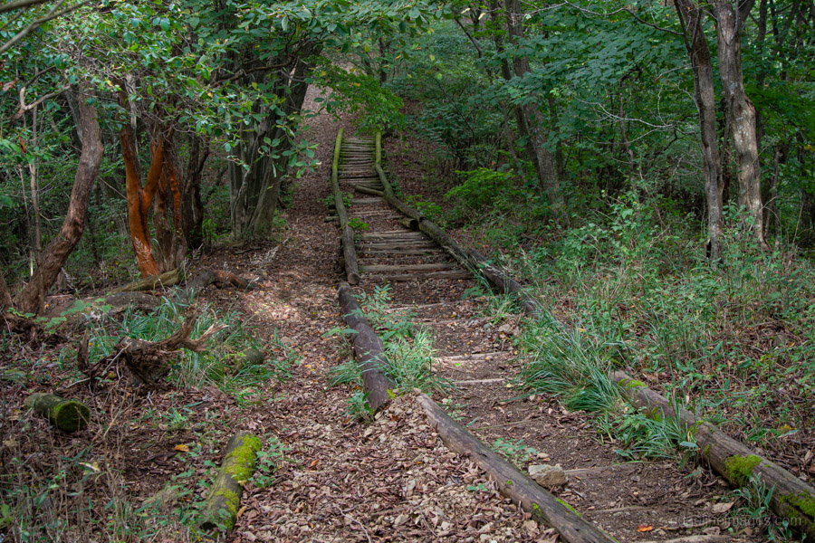 After leaving the bus stop and noting the return times, head straight, turning left at the first junction. The trail properly begins next to a private house. Cross the stream and enter the mountain path. From the outset, it’s reasonably steep and continues this way until the summit. It takes around 10 minutes to reach the first road crossing and another 30 minutes to reach the second, which was completely overgrown on the far side, making it difficult to see where the trail continued—almost dead across.