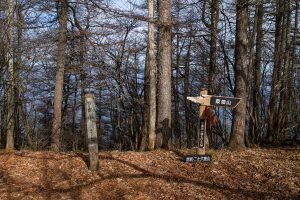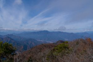 Continuing along the undulating ridgeline, you pass Mt. Gozeriyama 御座入山 (1,480 m) – the highest point on the course – and Nishigahara 西ヶ原, an alternative route through a valley that reconnects with the main ridge. Note that due to accumulated leaf litter, the trail can at times be hard to follow, and I occasionally found myself drifting off course. On a clear day, the summit of Akaiwa 赤岩 rewards you with a truly spectacular 360-degree panoramic view. During my visit, however, the clouds had moved in a little too early to catch Mt. Fuji in its full glory. To the left in front of Mt. Fuji lies Mt. Mishotai, and to the right is Mt. Shakushi.