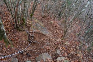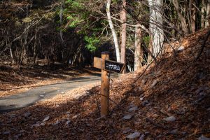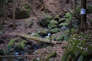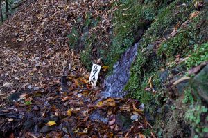 Soon after I arrived, several more hikers reached the summit to eat their lunch. When you’re ready to head off, the trail begins its descent on the opposite side of the summit. Proceed with caution and keep an eye on your GPS, as leaf debris can obscure the path, though there are occasional signs and bits of pink tape. On the way down the mountain, there is a water source called Sennin-mizu 仙人水, which apparently never dries up.