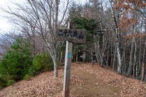 After taking in the view, the trail has some ups and downs as it descends to the forest road intersection 林道出合. After a short walk along the forest road, the hiking trail begins again, and after about 15 minutes of climbing, you reach the summit of Mt. Nijurokuya 二十六夜山 (1,297 m). This is another mountain that should offer a direct view of Fuji-san ahead, but it was similarly hidden by clouds. In the past, a moon-viewing event was held on this summit on the 26th of July, the time of year when the moon rises the latest. People would gather for parties, eating and drinking while waiting for the moon to appear.