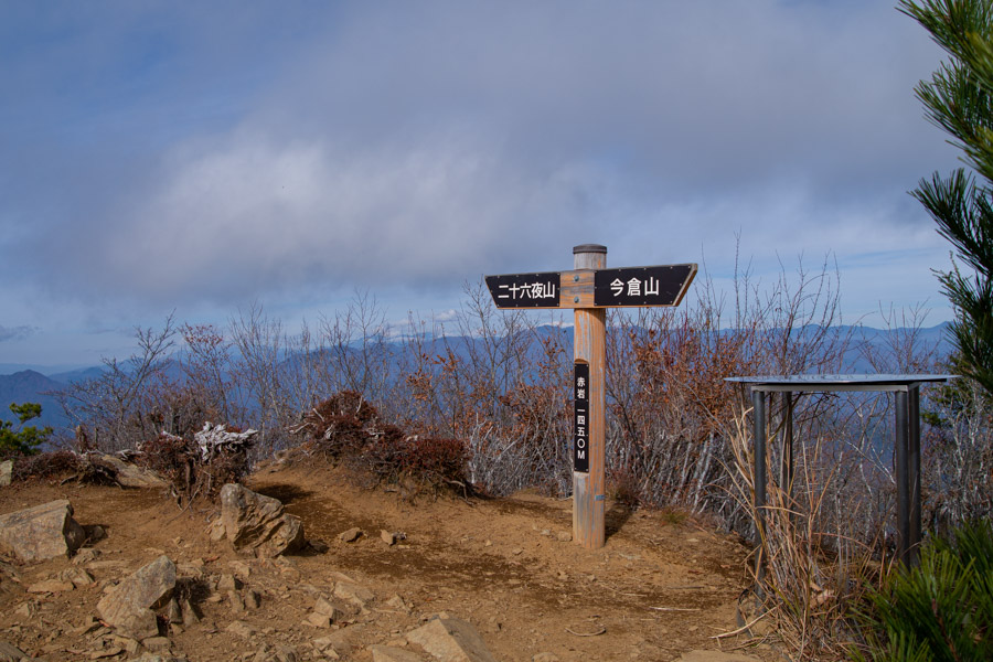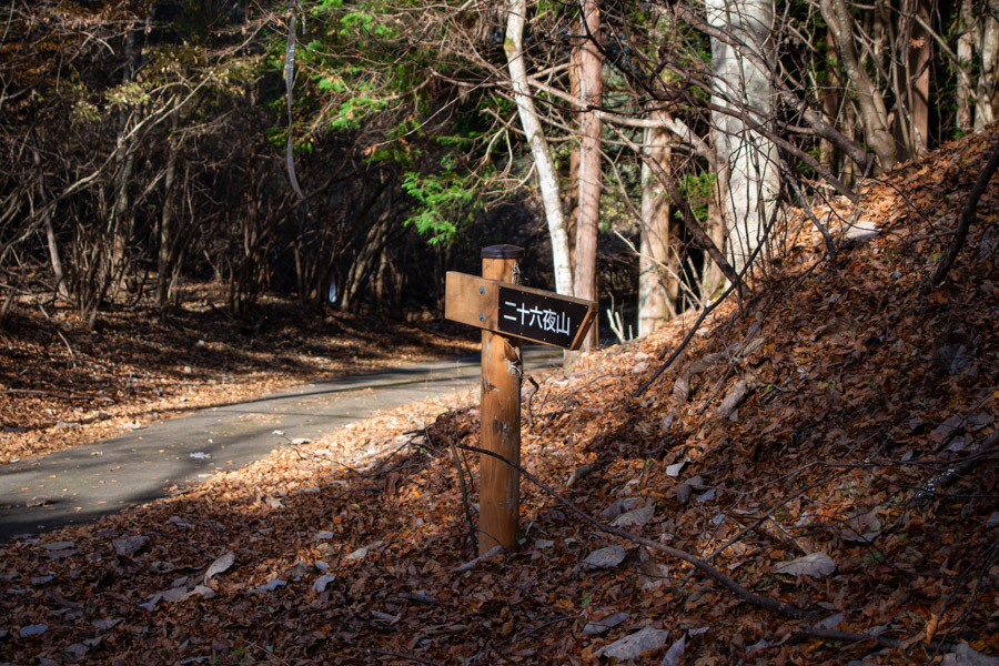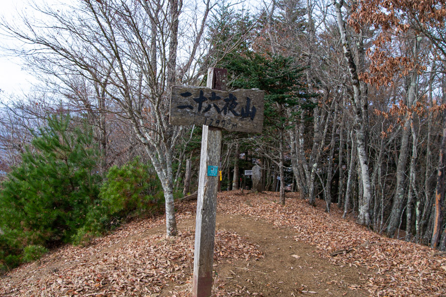After taking in the view, the trail has some ups and downs as it descends to the forest road intersection 林道出合. After a short walk along the forest road, the hiking trail begins again, and after about 15 minutes of climbing, you reach the summit of Mt. Nijurokuya 二十六夜山 (1,297 m). This is another mountain that should offer a direct view of Fuji-san ahead, but it was similarly hidden by clouds. In the past, a moon-viewing event was held on this summit on the 26th of July, the time of year when the moon rises the latest. People would gather for parties, eating and drinking while waiting for the moon to appear.