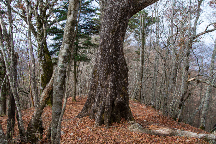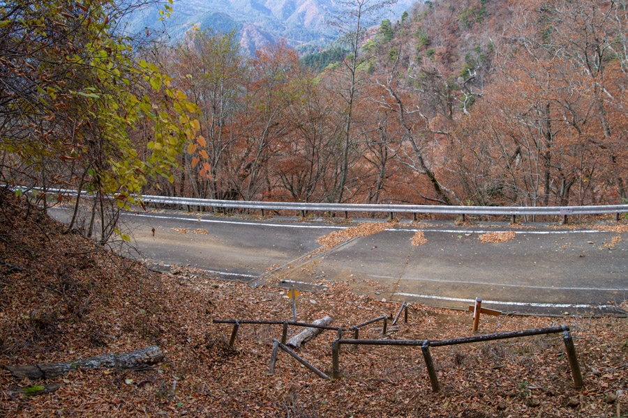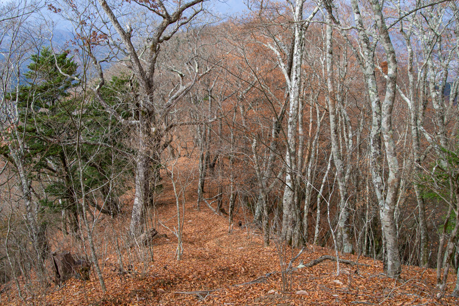 Continuing along the undulating ridgeline, you pass Mt. Gozeriyama 御座入山 (1,480 m) – the highest point on the course – and Nishigahara 西ヶ原, an alternative route through a valley that reconnects with the main ridge. Note that due to accumulated leaf litter, the trail can at times be hard to follow, and I occasionally found myself drifting off course. On a clear day, the summit of Akaiwa 赤岩 rewards you with a truly spectacular 360-degree panoramic view. During my visit, however, the clouds had moved in a little too early to catch Mt. Fuji in its full glory. To the left in front of Mt. Fuji lies Mt. Mishotai, and to the right is Mt. Shakushi.