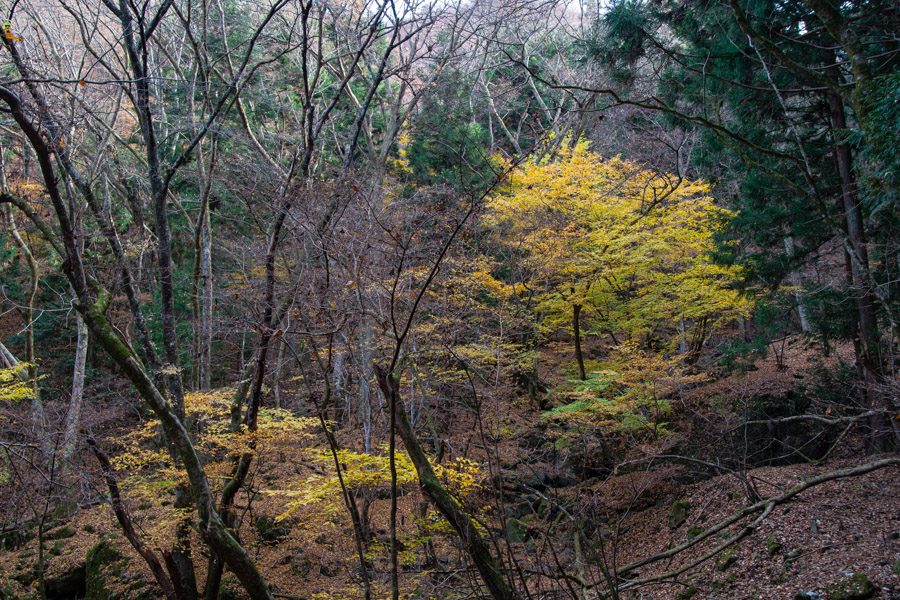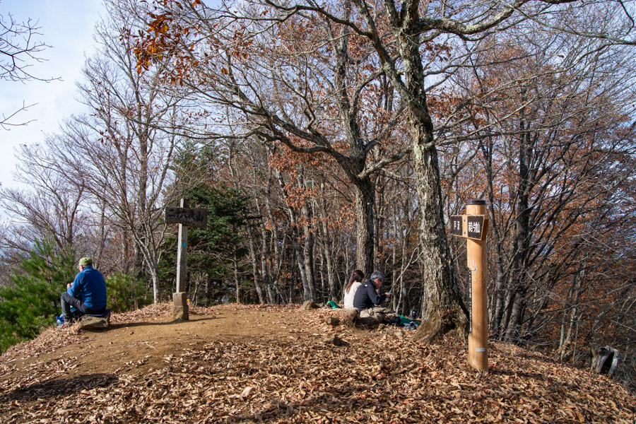 Soon after I arrived, several more hikers reached the summit to eat their lunch. When you’re ready to head off, the trail begins its descent on the opposite side of the summit. Proceed with caution and keep an eye on your GPS, as leaf debris can obscure the path, though there are occasional signs and bits of pink tape. On the way down the mountain, there is a water source called Sennin-mizu 仙人水, which apparently never dries up.
