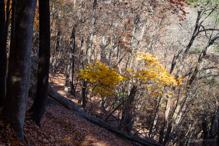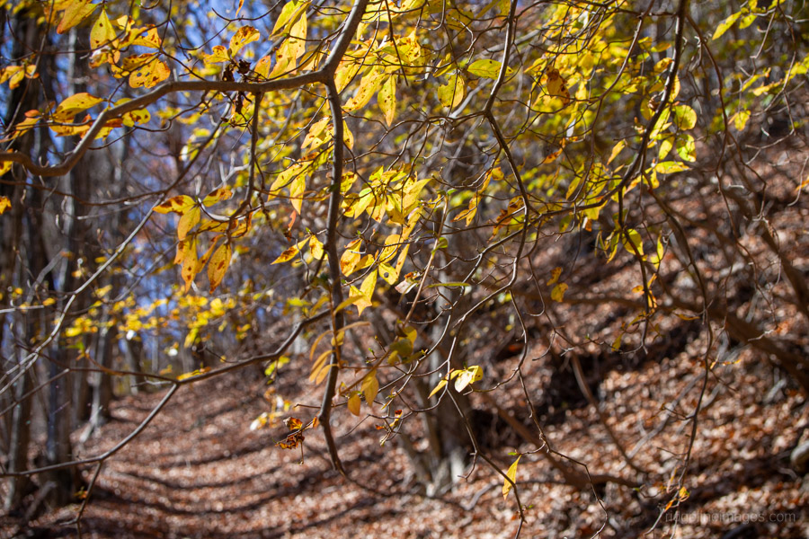 Once you get off the bus, continue briefly in the same direction it was heading, then turn left and follow the minor road to the gate that marks the official start of the trail. Beyond the gate, the rough path passes through plantation forest before climbing a long, gentle ridge. Surprisingly, even in late November there were still some lingering autumn colours.