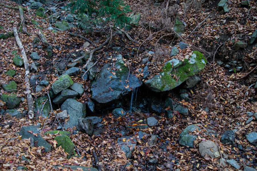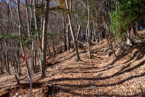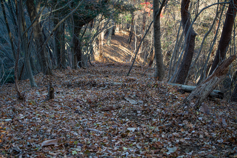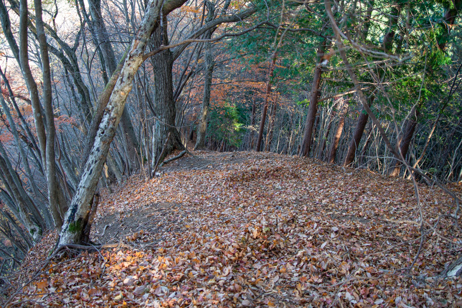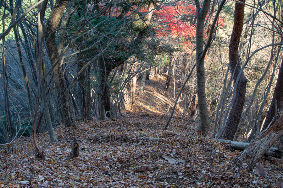 After returning to the ridgeline, turn left and begin the descent back towards the road. The initial stretch down to the next trail branch and Myojo-daira 明星平 isn’t particularly steep, but the grade soon increases sharply. Combined with a layer of dried leaves underfoot, the trail becomes quite slippery, and without trekking poles I often had to use my hands to steady myself and clamber down safely.