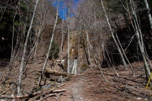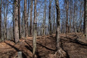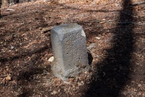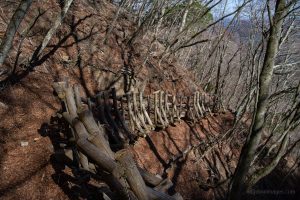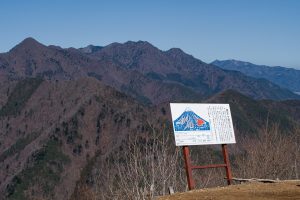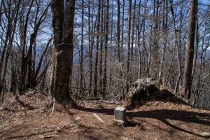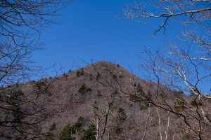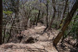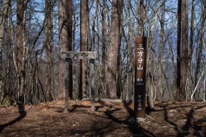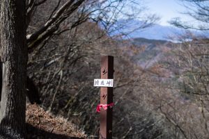 Adjacent to Mt. Sanpobun is Mt. Shojinyama 精進山, of nearly equal elevation. From here, the trail descends sharply. The ground is dry and sandy, making it slippery underfoot. After losing some altitude, you reach the saddle at Shoji-toge 精進峠 with a lookout point nearby, followed by Neko-toge 根子峠.