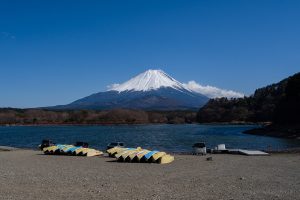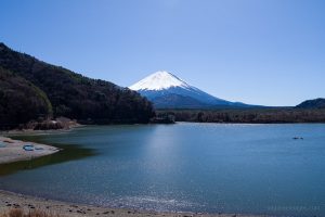 From this part of the lake, Mt. Fuji is commonly called “Child-Holding Fuji” because Mt. Omuro overlaps it in the foreground; a short distance up the trail, a viewpoint offers an even clearer look at this formation. Lake Shoji is relatively shallow and prone to eutrophication, resulting in lower water quality. Interestingly, despite appearing isolated with no visible inlets or outlets, its surface elevation is linked to Lake Saiko and Lake Motosu, suggesting the three are connected by underground waterways.