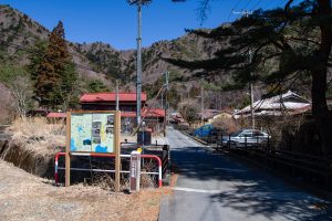 The Old Nakamichi Road begins behind the bus stop, once the shortest route between Kai (Yamanashi) and Suruga (Shizuoka) provinces. The road quickly leads to Suwa-jinja 諏訪神社 and the Shoji Cedar, a giant 40-metre tree. Shortly after, the pavement ends and the mountain trail begins.