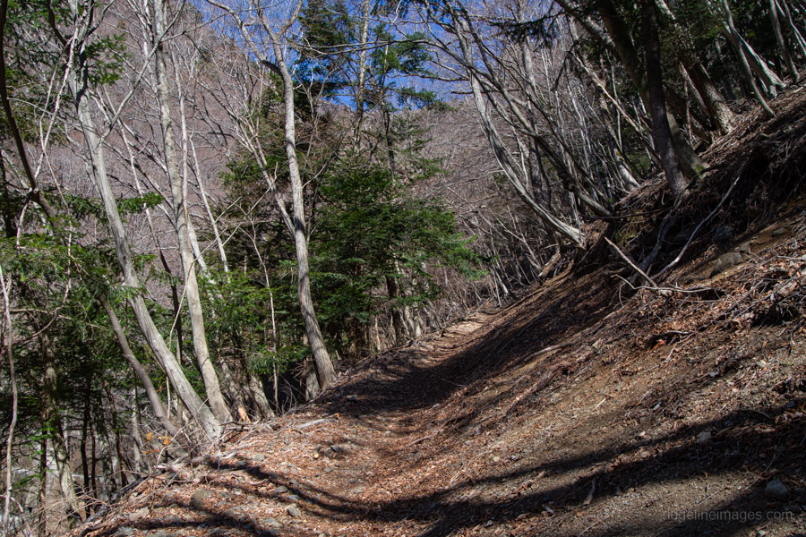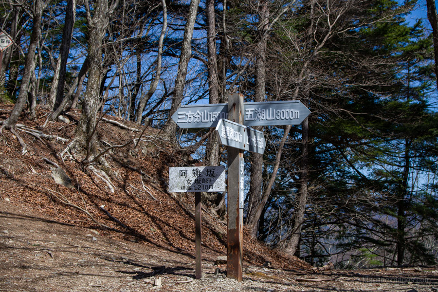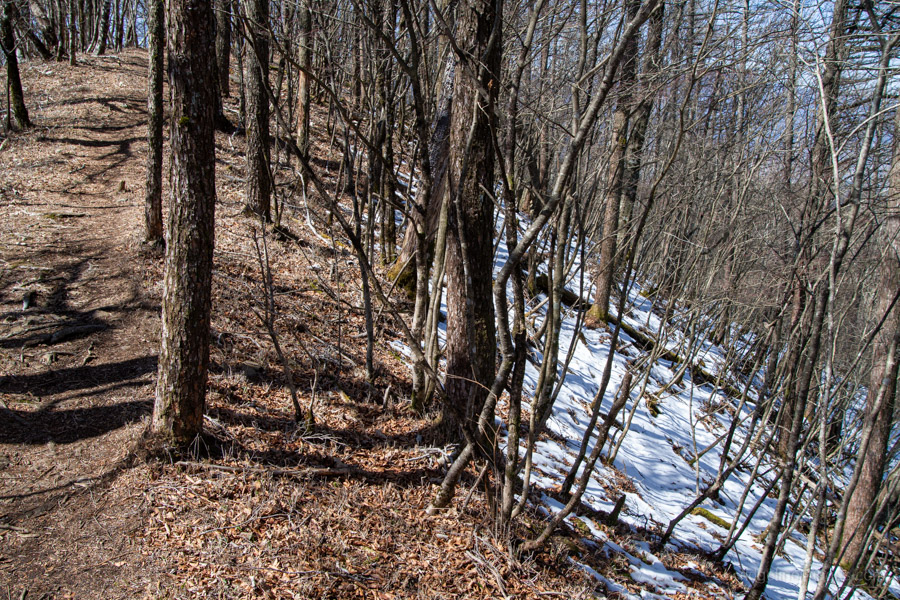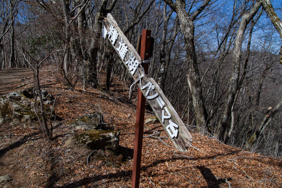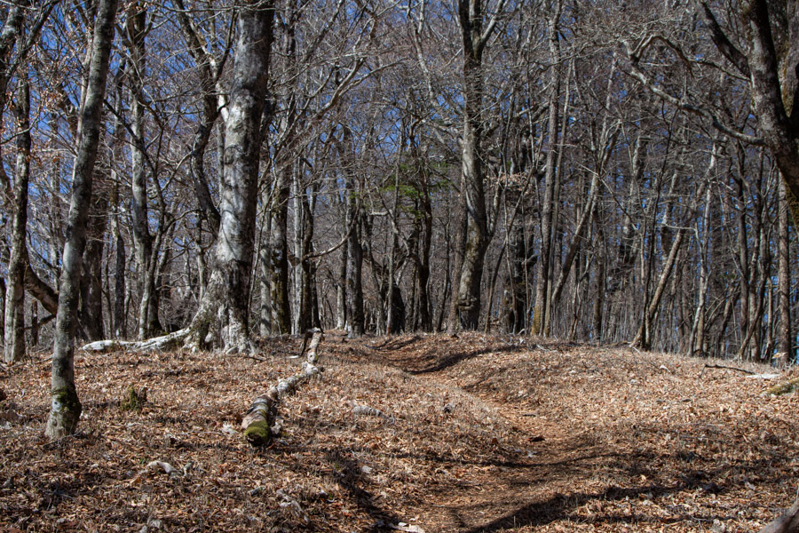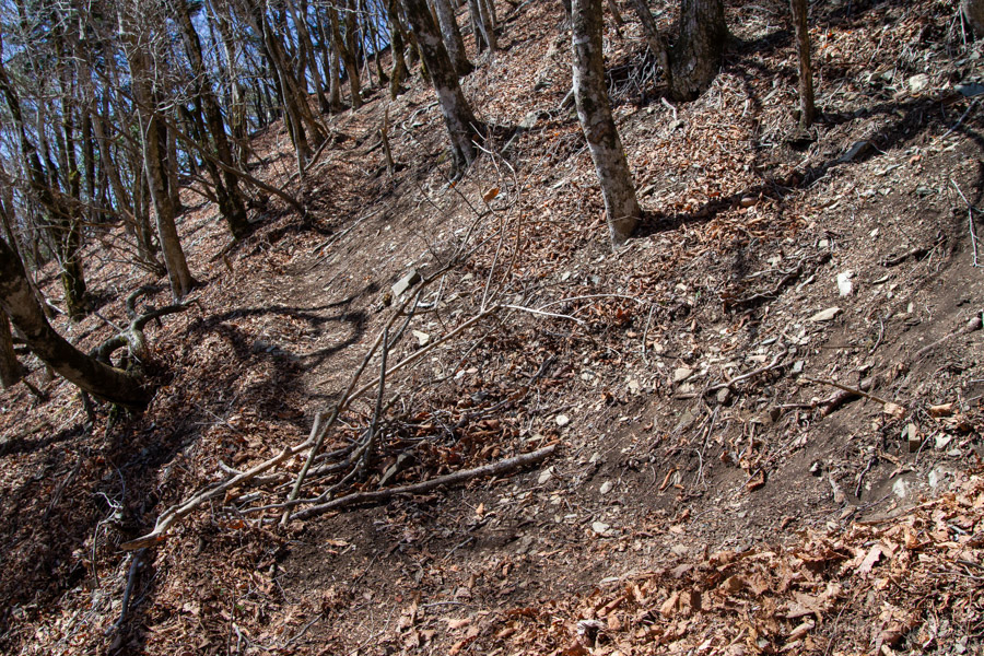 Adjacent to Mt. Sanpobun is Mt. Shojinyama 精進山, of nearly equal elevation. From here, the trail descends sharply. The ground is dry and sandy, making it slippery underfoot. After losing some altitude, you reach the saddle at Shoji-toge 精進峠 with a lookout point nearby, followed by Neko-toge 根子峠.