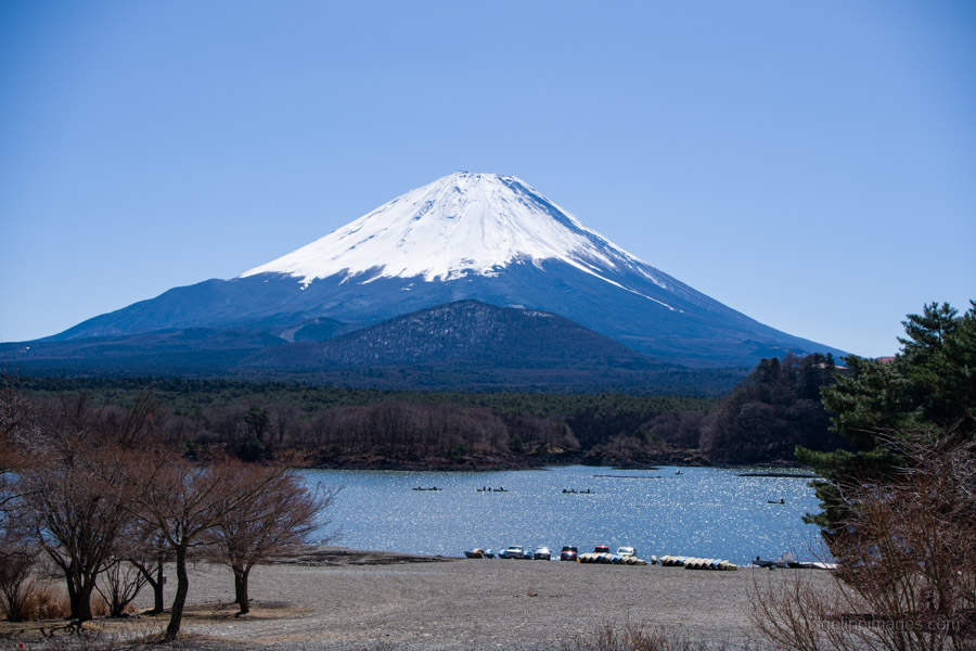 From this part of the lake, Mt. Fuji is commonly called “Child-Holding Fuji” because Mt. Omuro overlaps it in the foreground; a short distance up the trail, a viewpoint offers an even clearer look at this formation. Lake Shoji is relatively shallow and prone to eutrophication, resulting in lower water quality. Interestingly, despite appearing isolated with no visible inlets or outlets, its surface elevation is linked to Lake Saiko and Lake Motosu, suggesting the three are connected by underground waterways.