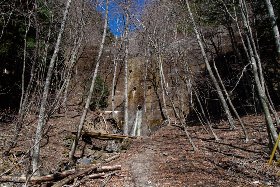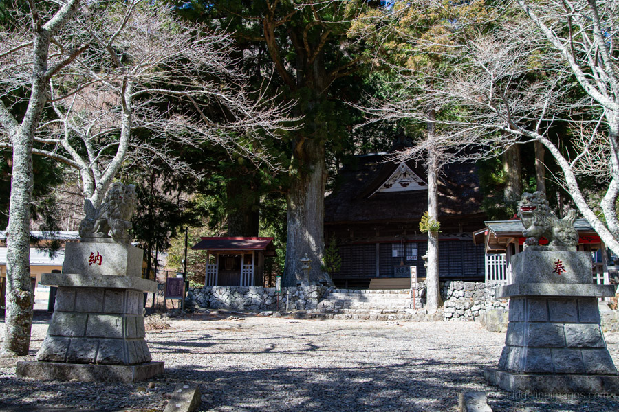 The Old Nakamichi Road begins behind the bus stop, once the shortest route between Kai (Yamanashi) and Suruga (Shizuoka) provinces. The road quickly leads to Suwa-jinja 諏訪神社 and the Shoji Cedar, a giant 40-metre tree. Shortly after, the pavement ends and the mountain trail begins.