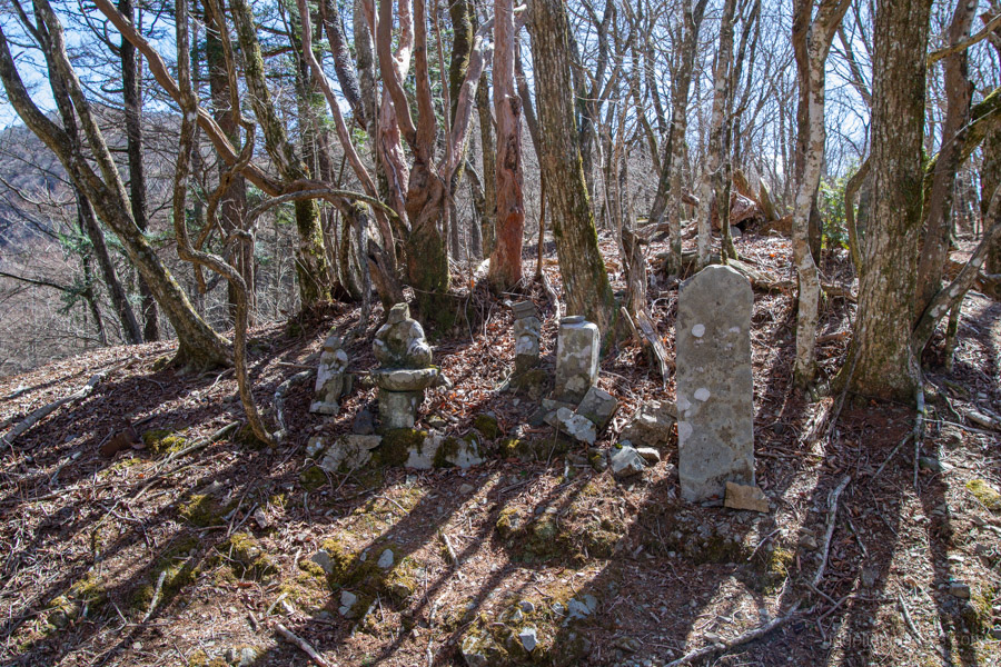 The route gains altitude rapidly via switchbacks, passing massive erosion-control dams that resemble castle walls. Keep an eye out for remnants of the ancient road, such as weathered stone walls; to your left, Mt. Sanpobun looms in the distance. It takes roughly 40 minutes to reach Onnazaka-toge 女坂峠 (1,206 m). Legend says a pregnant woman went into labor while crossing the pass and perished; the weathered Jizo statues here were enshrined in her memory.
