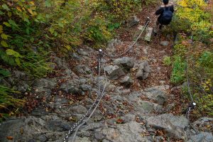 As you approach Mt. Gyoja 行者ヶ岳, the trail becomes steeper, with rocky stretches both before and after the peak. A small traffic jam had formed at the second chain section, though the steps are solid and the climb itself isn’t particularly difficult. Continuing on, a scaffolded path built over loose scree leads to Mt. Shindainichi 新大日, and a little further on, you’ll come to Kinomata-goya 木ノ又小屋. From here marks the final push to the summit.