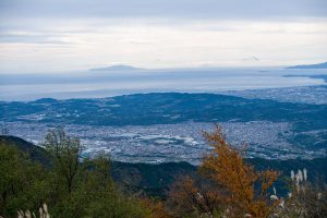 Continue past Kinhiyashi 金冷シ, where the trail branches off towards Mt. Nabewari 鍋割山. As you descend the scree slope, Sagami Bay spreads out before you. To the left, you can see the main ridge you traversed earlier in the day, with Mt. Oyama rising gracefully in the distance.