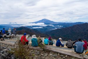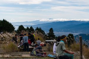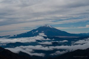 All told, it took me almost exactly four hours – the standard course time – to reach Mt. Tonodake 塔ノ岳 (1,491 m). Near the summit, I noticed a couple of guys awkwardly trying to position their camera for a group shot, so I offered to take the photo for them – a favour they gladly returned. As expected, a sizable crowd had gathered to enjoy the stunning, unobstructed view of Mt. Fuji. In the distance, the snow-capped peaks of the Southern Alps were also clearly visible.