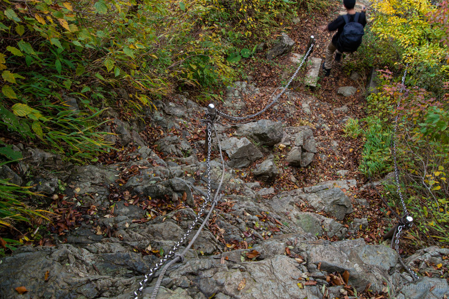 As you approach Mt. Gyoja 行者ヶ岳, the trail becomes steeper, with rocky stretches both before and after the peak. A small traffic jam had formed at the second chain section, though the steps are solid and the climb itself isn’t particularly difficult. Continuing on, a scaffolded path built over loose scree leads to Mt. Shindainichi 新大日, and a little further on, you’ll come to Kinomata-goya 木ノ又小屋. From here marks the final push to the summit.