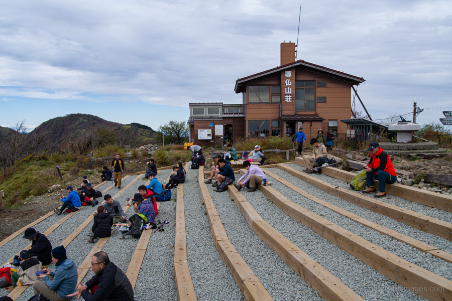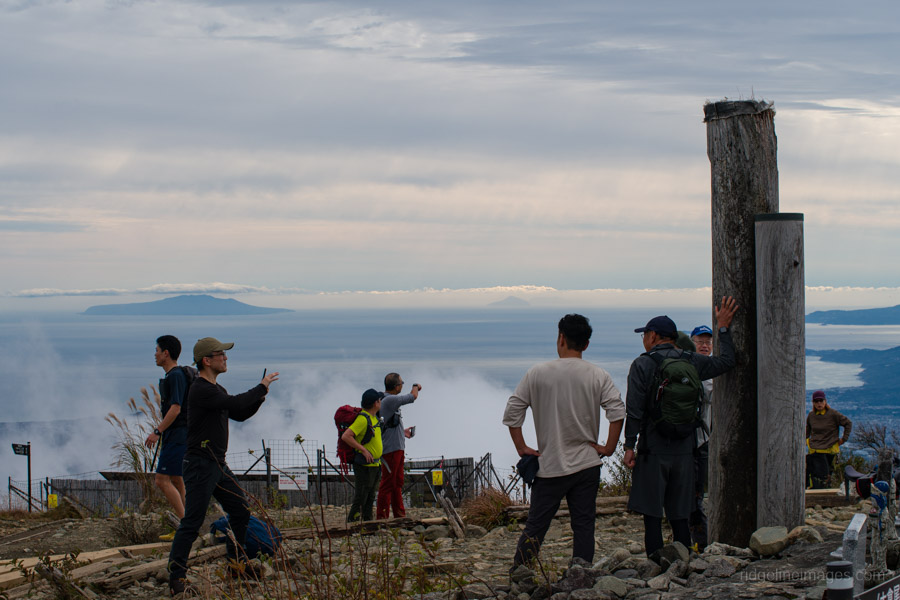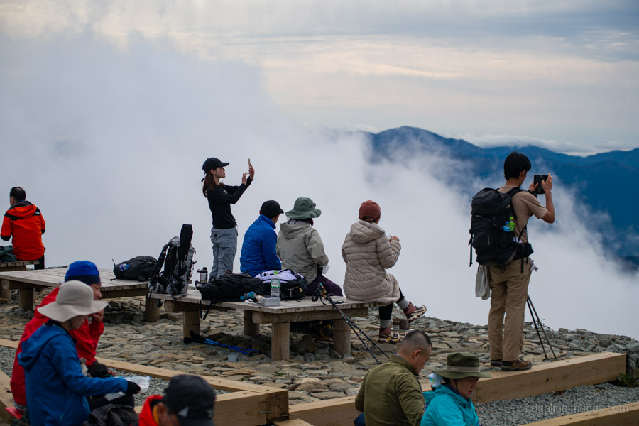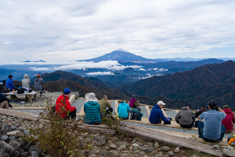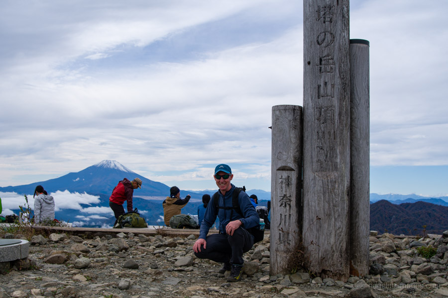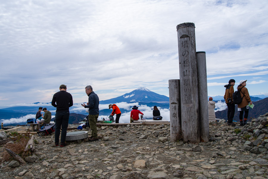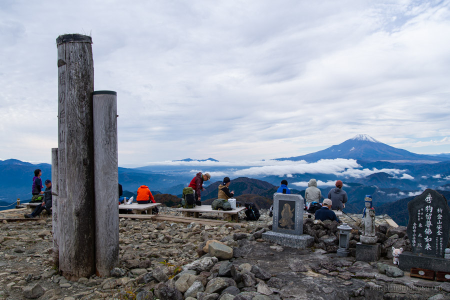 All told, it took me almost exactly four hours – the standard course time – to reach Mt. Tonodake 塔ノ岳 (1,491 m). Near the summit, I noticed a couple of guys awkwardly trying to position their camera for a group shot, so I offered to take the photo for them – a favour they gladly returned. As expected, a sizable crowd had gathered to enjoy the stunning, unobstructed view of Mt. Fuji. In the distance, the snow-capped peaks of the Southern Alps were also clearly visible.