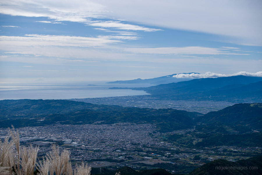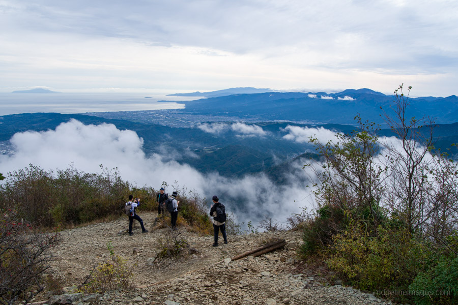 Continue past Kinhiyashi 金冷シ, where the trail branches off towards Mt. Nabewari 鍋割山. As you descend the scree slope, Sagami Bay spreads out before you. To the left, you can see the main ridge you traversed earlier in the day, with Mt. Oyama rising gracefully in the distance.