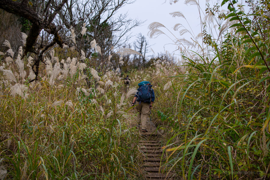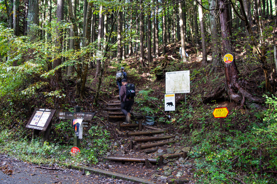 The main reason for starting this hike from Yabitsu Pass ヤビツ峠 is the plentiful bus service from Okura 大倉. Before that, however, you’ll need to tackle the long descent down the Okura Ridge – a 7 km stretch with an elevation drop of about 1,200 metres. This ridge is famously (or infamously) nicknamed Baka One バカ尾根, the “Fool’s Ridge”, for its seemingly endless, monotonous slope. It’s almost entirely made up of stairs – from start to finish.