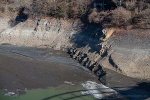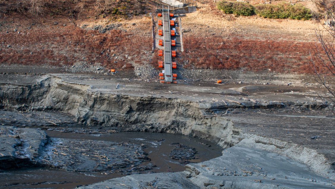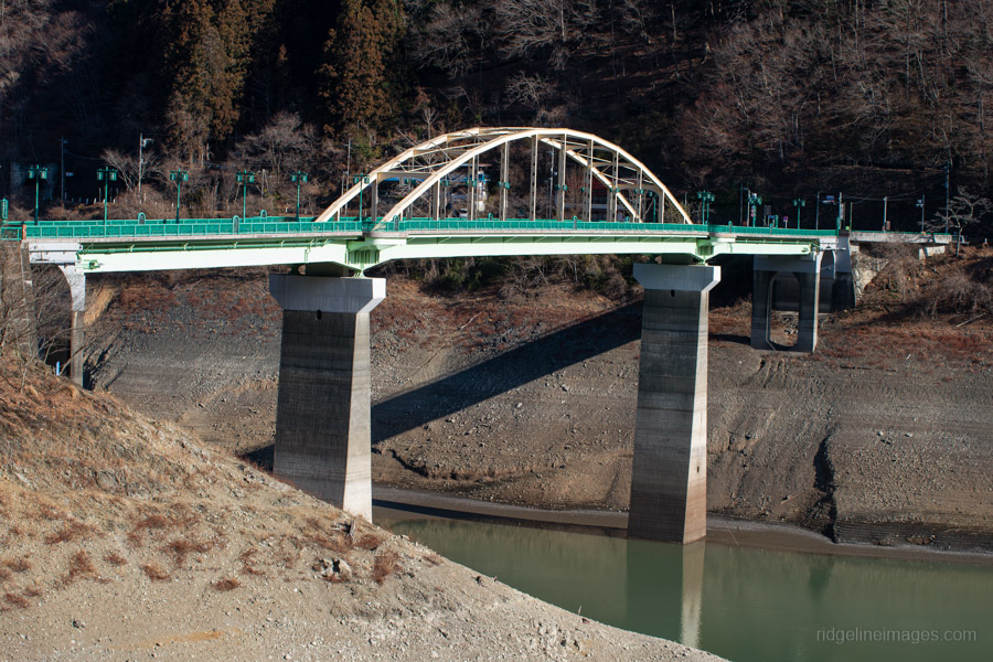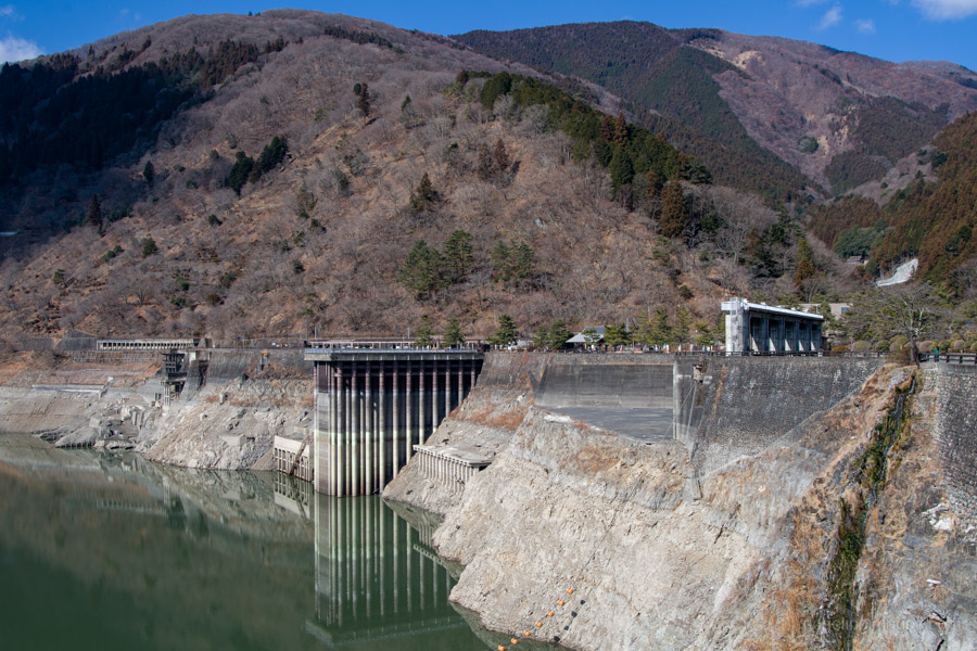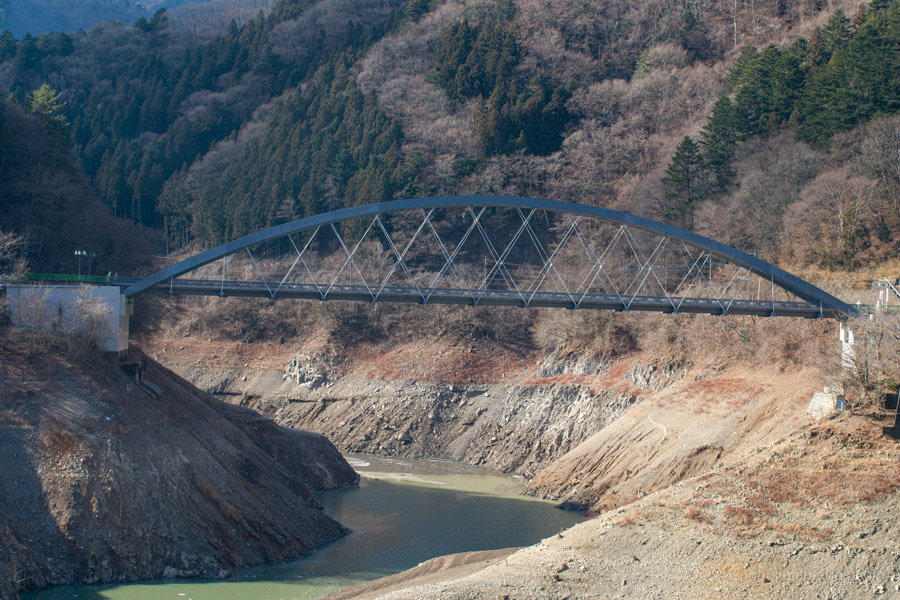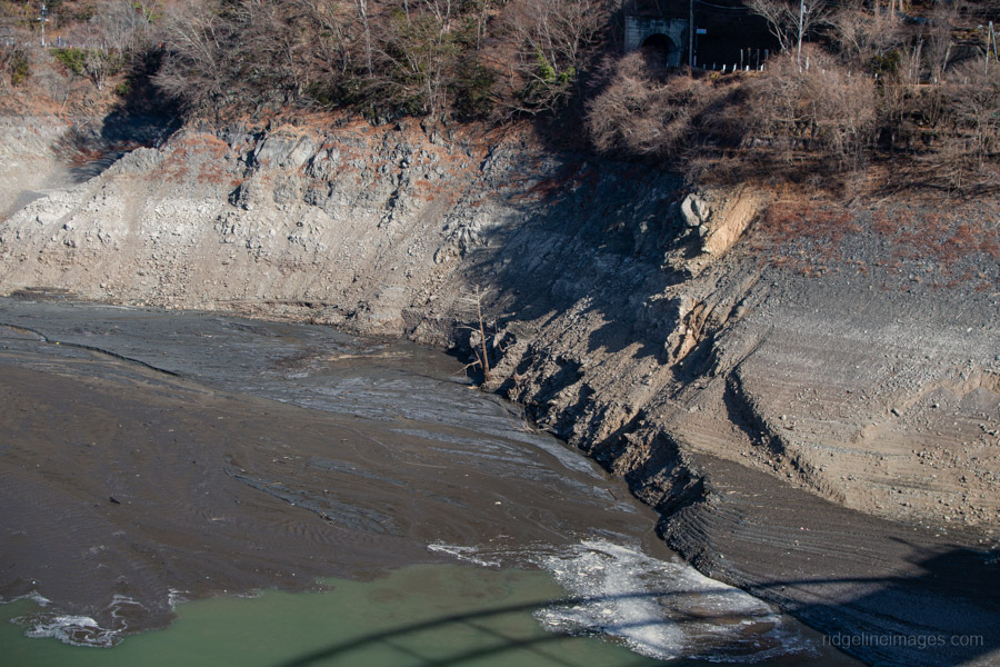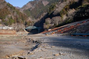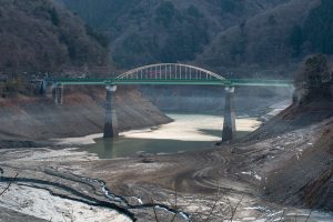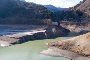 I’ve lost count of how many times over the years I’ve driven, ridden buses, or hiked – often directly across – the waters of Lake Okutama, via its two “drum bridges”. Formed by Ogouchi Dam, it has been both a familiar landscape and an important water source for Tokyo since the dam’s completion in 1957. Returning this past week and standing in much the same spot I stood almost exactly a decade ago, the view was noticeably different. Where I once looked out over a wide expanse of open water, much of the upper reservoir now lies exposed, with only a narrow, muddy channel tracing its way through silt and rock.