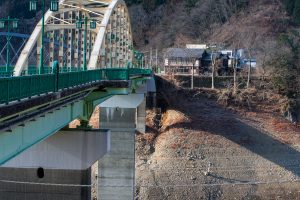A short walk back down the road towards Okutama Station brought me to the day’s second inspection point at Miyama Bridge. Comparison photographs taken in February 2016 and February 2026 reveal a clear change. The shimmering green reflection once cast by the bridge’s painted steel onto the water below has disappeared, replaced by a noticeably lowered waterline. One of the more haunting features here is the skeletal remains of trees that once stood within the grounds of households in the former village of Ogouchi.