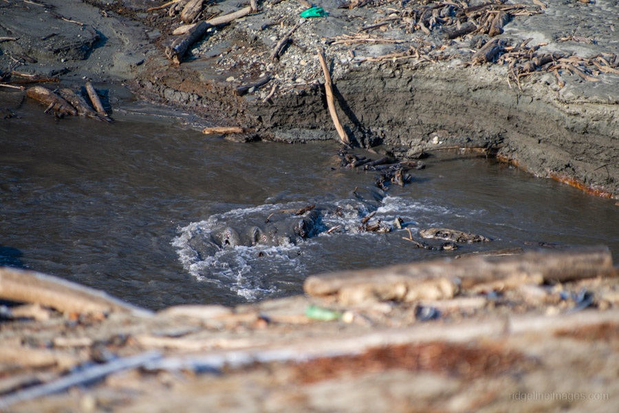 Shallow, sluggish flow of muddy water in Lake Okutama’s upper reaches.